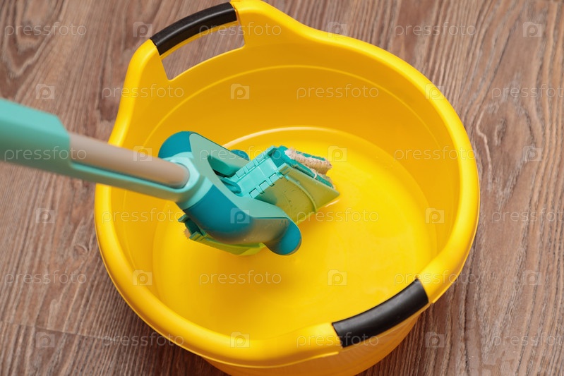 Синяя швабра с желтым тазом для уборки и мытья полов