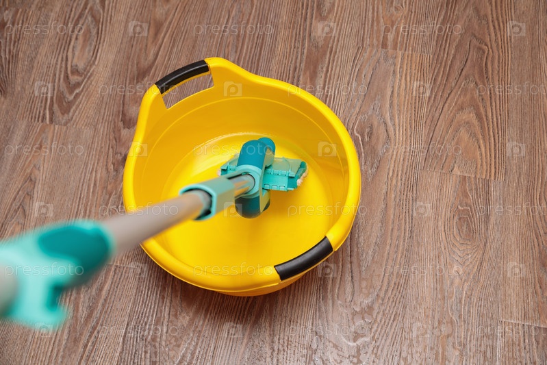 Синяя швабра с желтым тазом для уборки и мытья полов