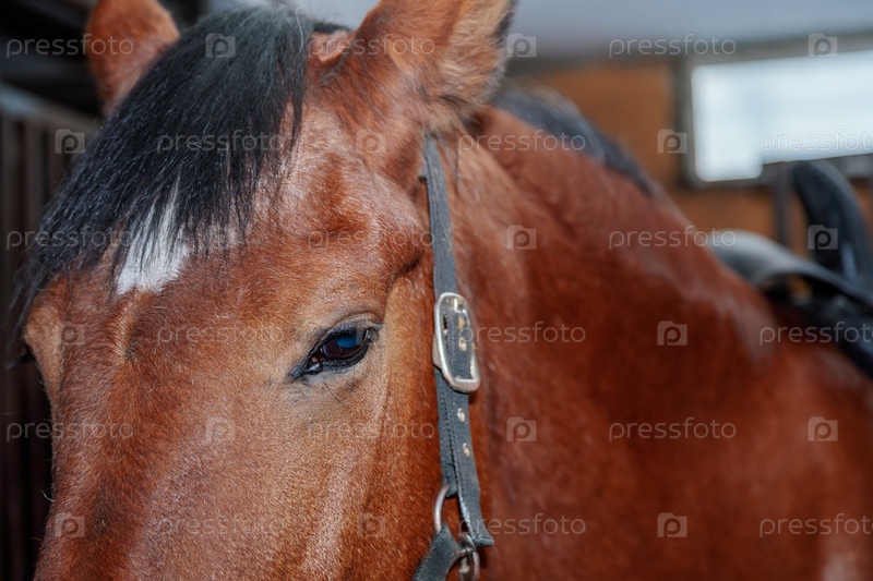 Крупным планом портрет лошади зимой на закате. коричневый цвет
