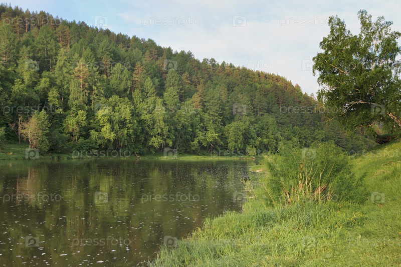 Красочный пейзаж с горами и красивой спокойной рекой в России. Река Ай