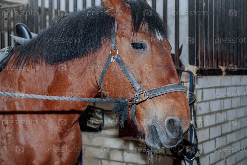 Крупным планом портрет лошади зимой на закате. коричневый цвет