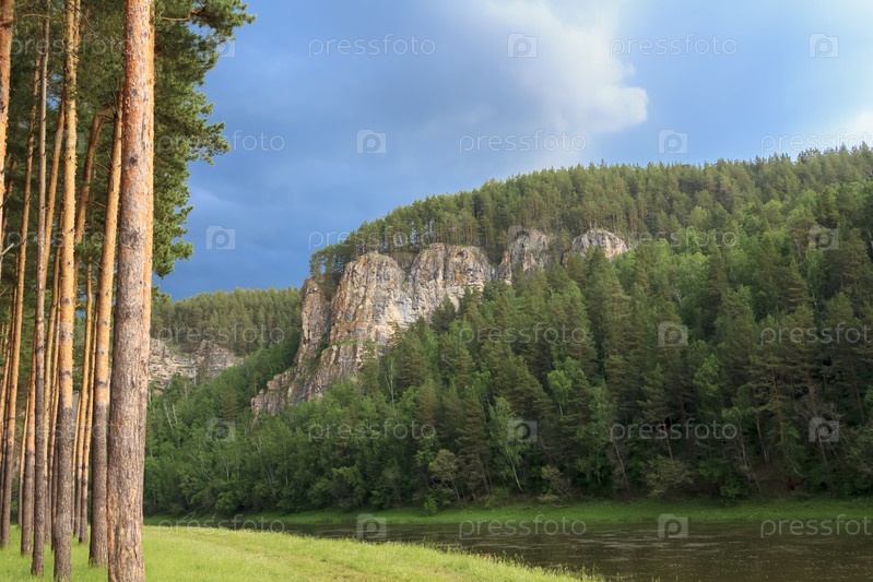 Красочный пейзаж с горами и красивой спокойной рекой в России. Река Ай
