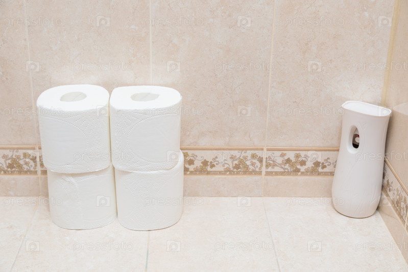 Рулоны белой туалетной бумаги и освежителя воздуха на полке унитаза