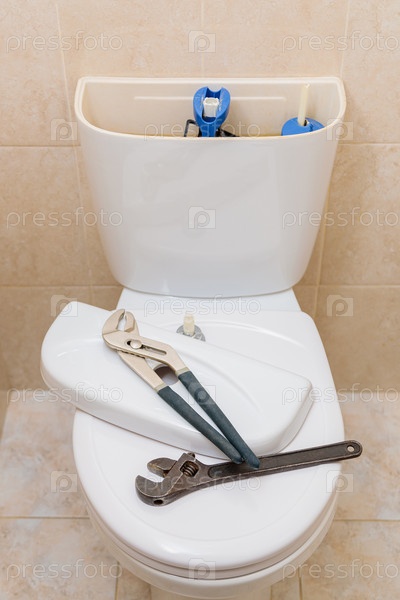 Сантехнические инструменты в туалете на белом унитазе
