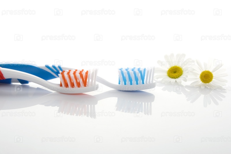 Две зубные щетки и ромашка на белом