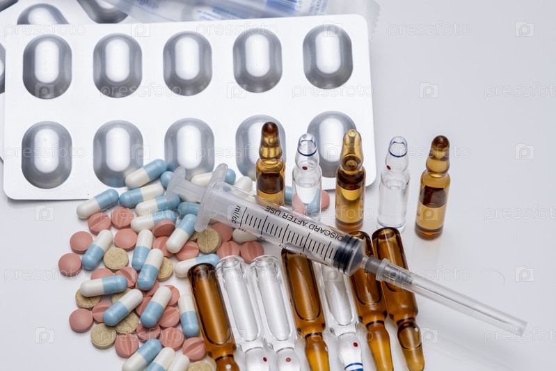 Разнообразное лекарство свалено в одну кучу и лежит на столе