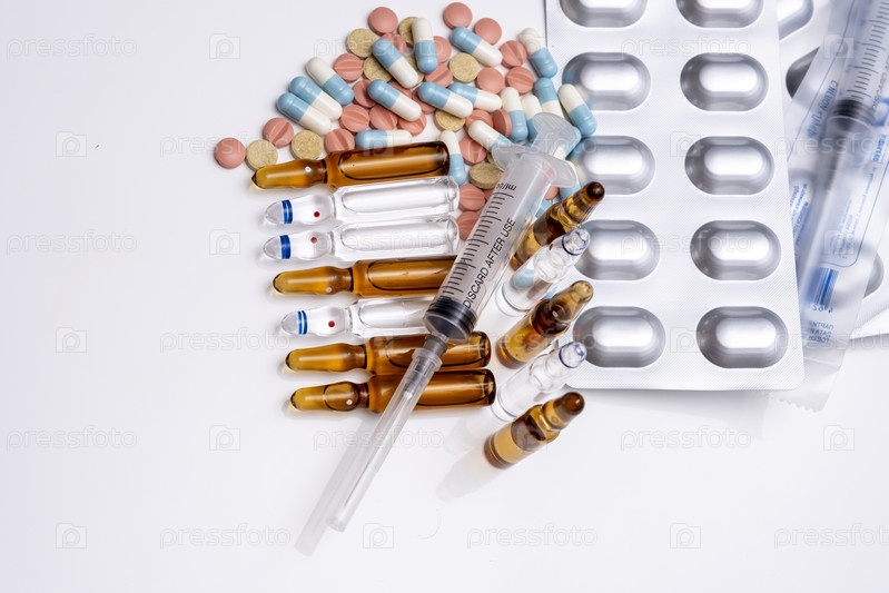 Разнообразное лекарство свалено в одну кучу и лежит на столе