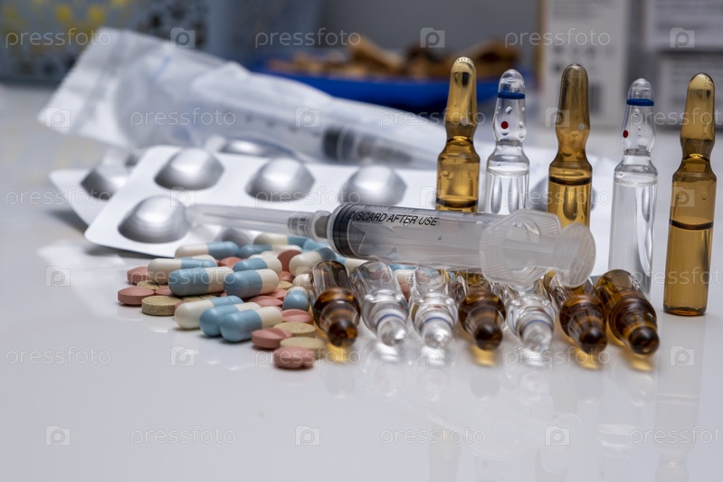 Разнообразное лекарство свалено в одну кучу и лежит на столе
