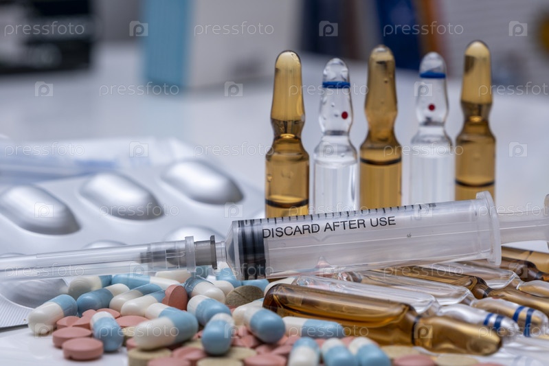 Лекарство в таблетках и ампулах лежит на столе