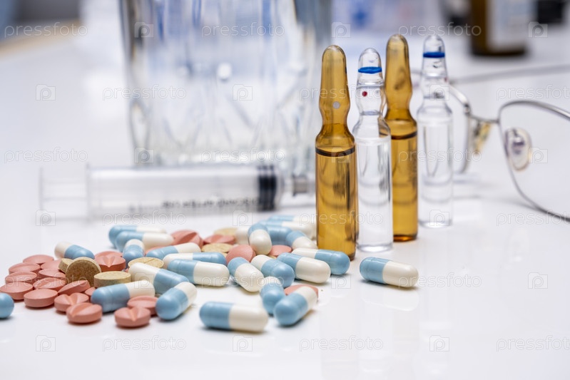 Лекарство в таблетках и ампулах лежит на столе