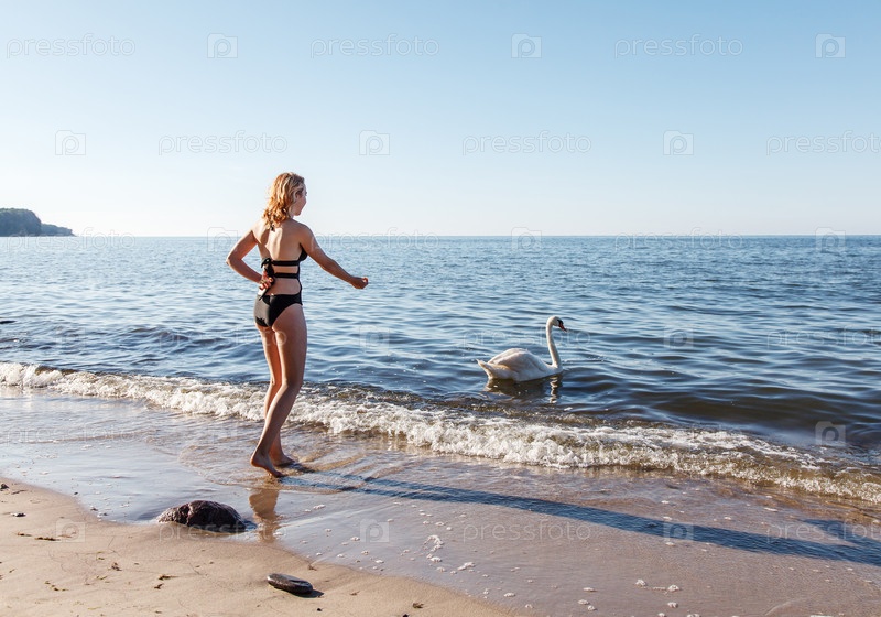 Молодая девушка в черном купальнике кормит лебедя у моря