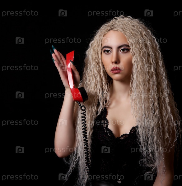 Блондинка с длинными вьющимися волосами притворяется куклой с телефоном