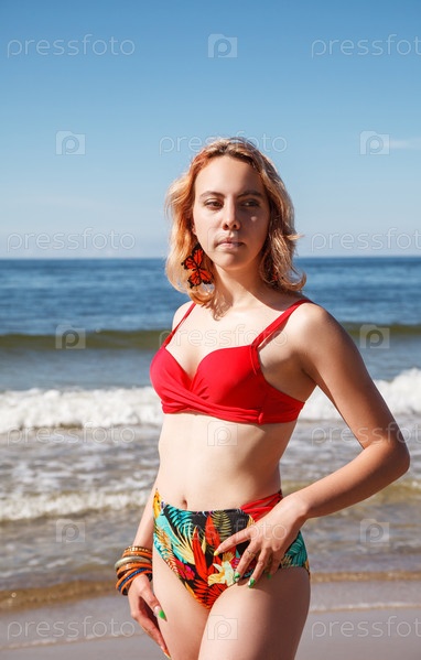 Молодая блондинка в красном купальнике стоит на берегу моря