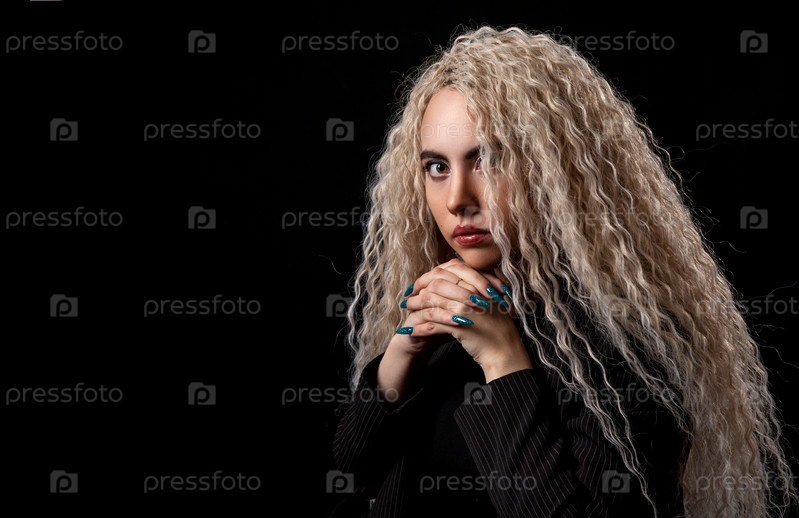 Портрет молодой блондинки с длинными вьющимися волосами в студии на черном фоне