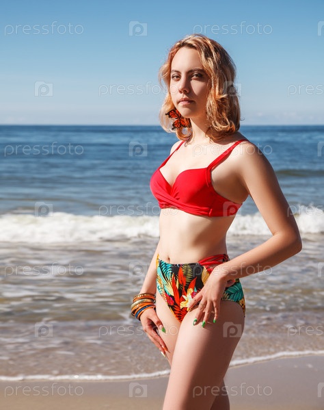 Молодая блондинка в красном купальнике стоит на берегу моря