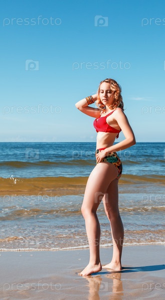 Молодая блондинка в красном купальнике стоит на берегу моря