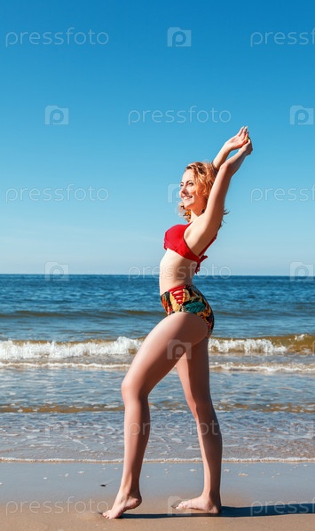 Молодая блондинка в красном купальнике стоит на берегу моря