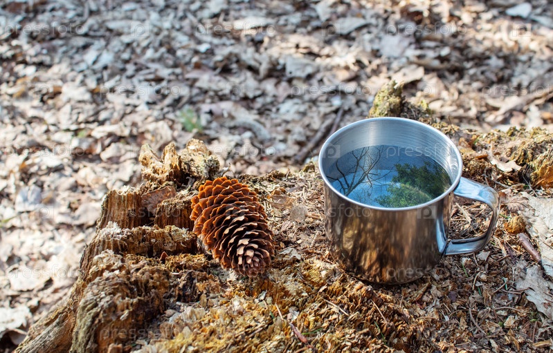 Металлическая чашка с водой на пне в лесу