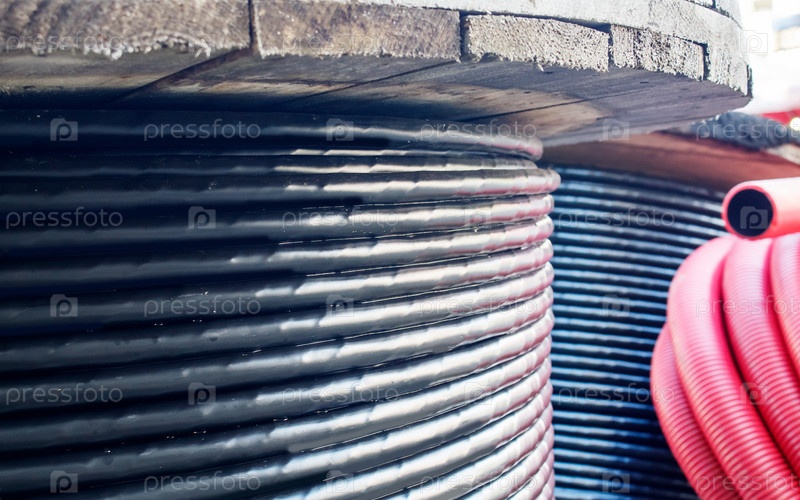 Большие деревянные катушки с кабелем, подготовленные для прокладки на открытом воздухе в солнечный летний день
