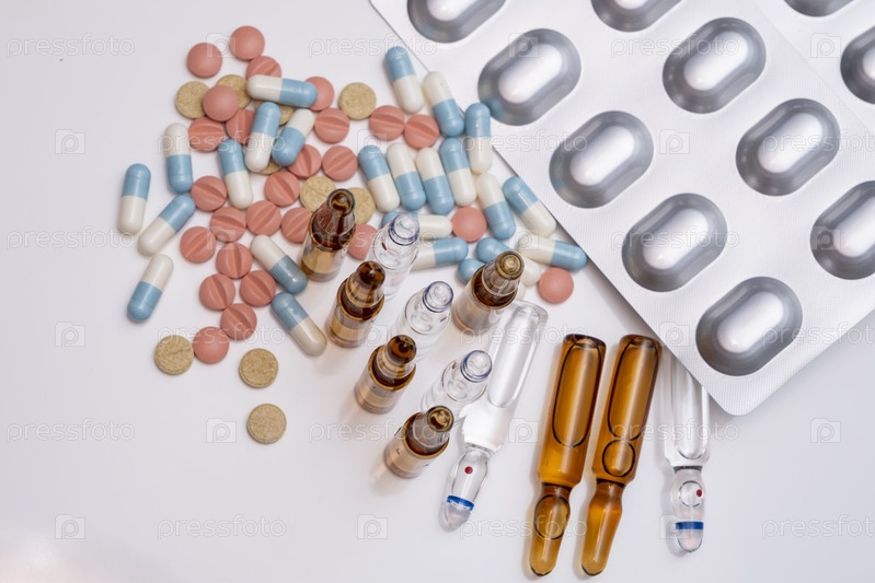 Набор разнообразных лекарств на белом столе