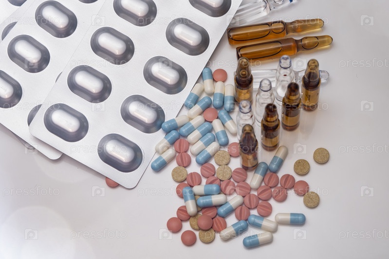 Набор разнообразных лекарств на белом столе