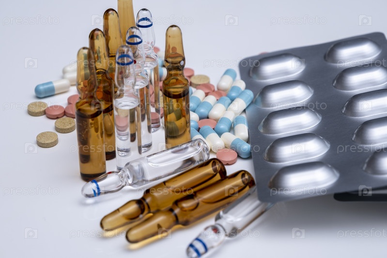Набор разнообразных лекарств на белом столе
