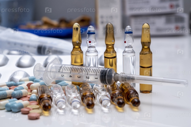 Набор разнообразных лекарств на белом столе