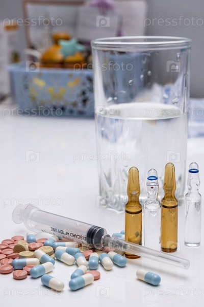 Набор разнообразных лекарств на белом столе