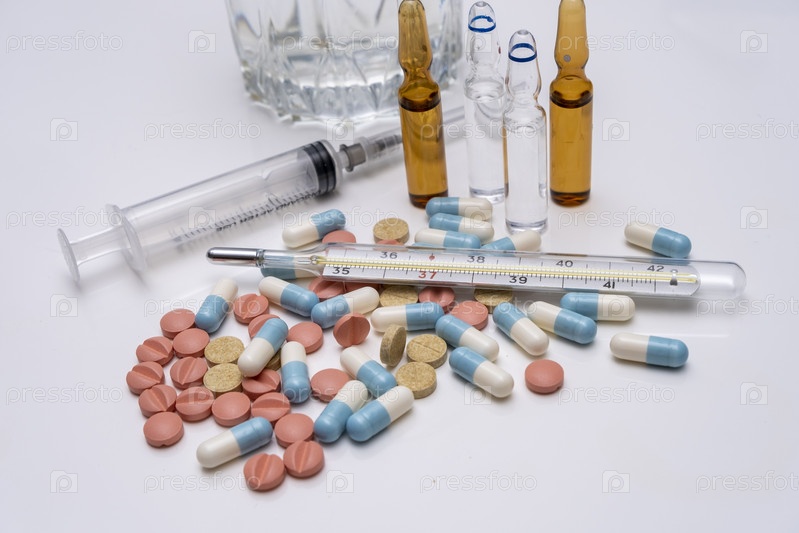 Разнообразное лекарство свалено в одну кучу и лежит на столе