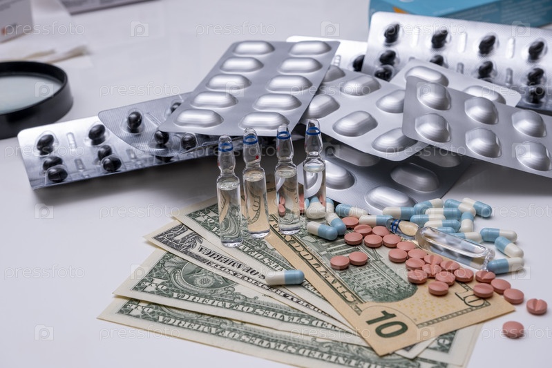 Разнообразное лекарство свалено в одну кучу и лежит на столе