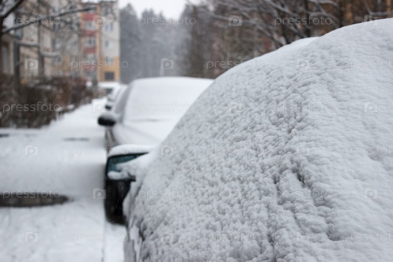Автомобиль, покрытый снегом в зимний день на улице города