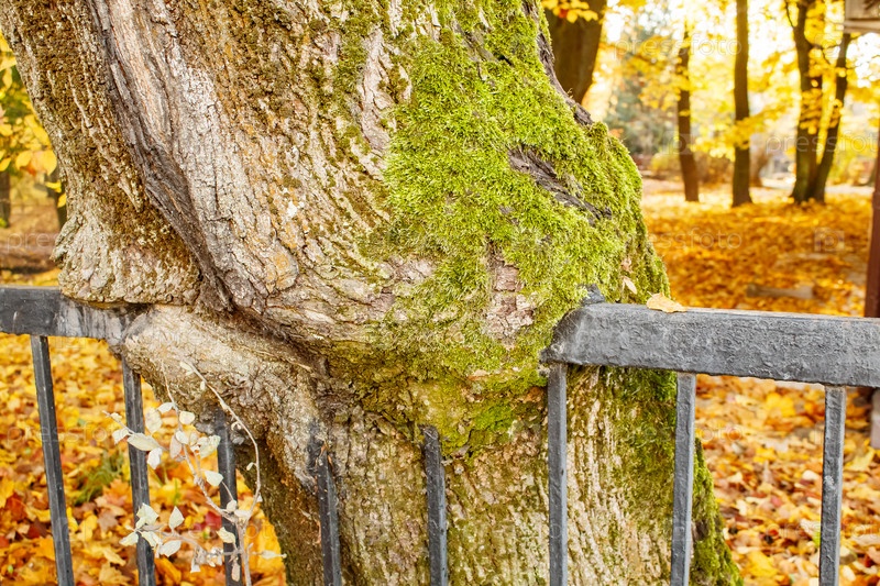 Черный металлический забор, встроенный в дерево. крупный план. сунну осенний день