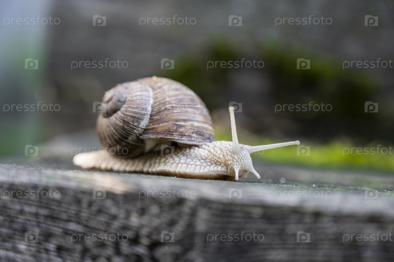 Улитка ползает по старой доске крупным планом