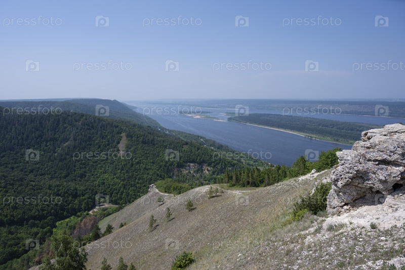 Вид на реку Волгу и гору Стрельню в Самарской области в России. Ясный солнечный день 27 июля 2021 года