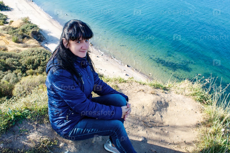 Молодая женщина сидит на высоком берегу моря