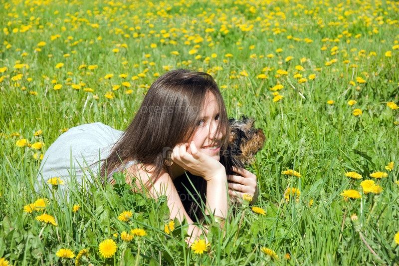 Девушка на лугу с собачкой