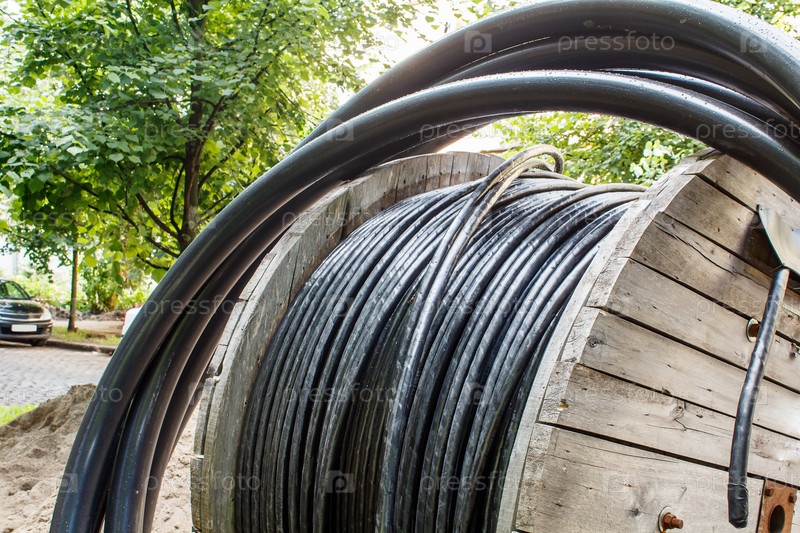 Большая деревянная промышленная катушка с кабелем