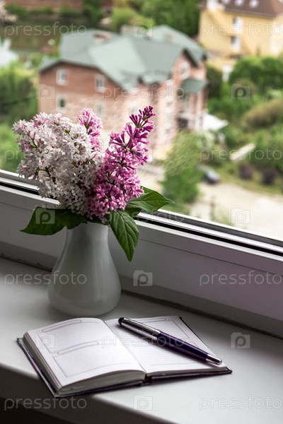 Уютный домашний натюрморт: весенние цветы сирени в белой вазе на подоконнике, блокнот и очки. Ретро стиль