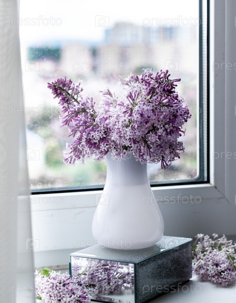 Натюрморт на подоконнике с цветущей сиренью в белой вазе. Весенние цветы, винтажный стиль