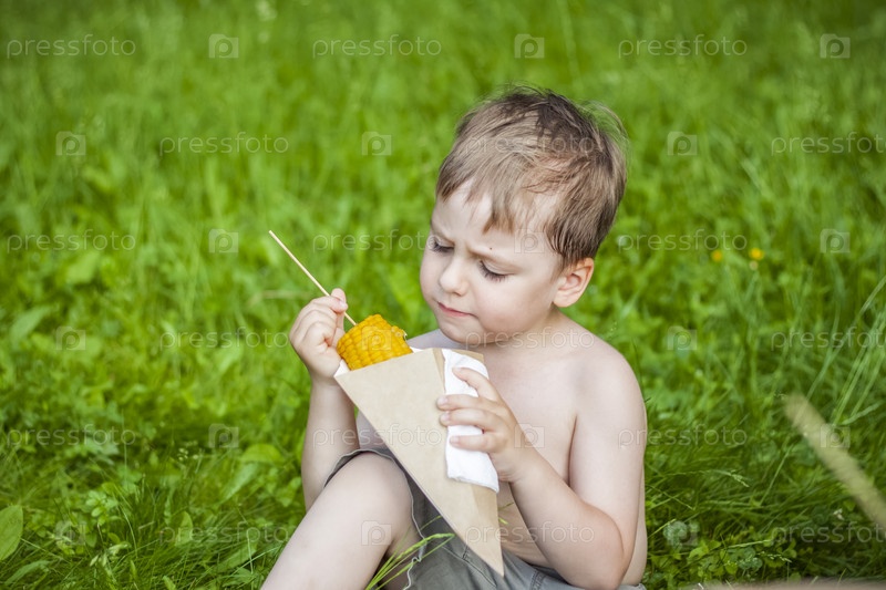 Симпатичный белокурый мальчик аппетитно ест кукурузу летом, сидя на берегу реки на сочной траве. Забавное выражение лица