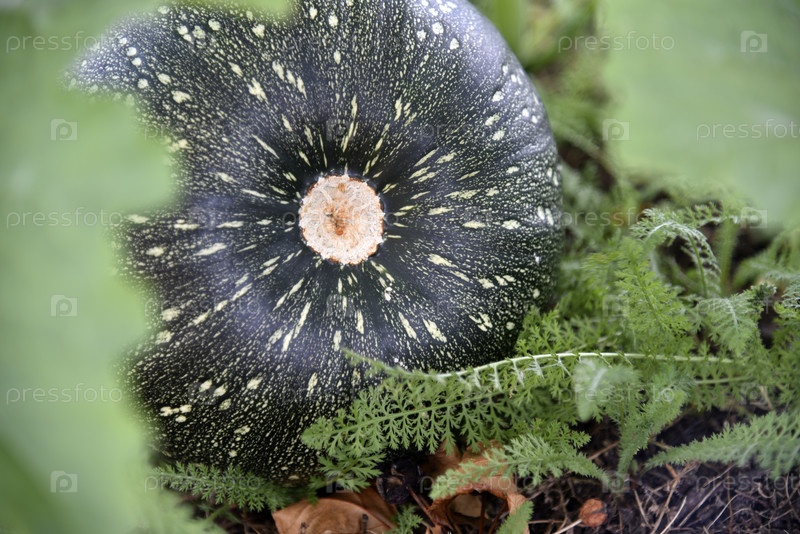 Плод зеленой тыквы к кустам в летнем саду. Тыква в зеленых листьях в лучах солнца. Красивая тыква летом