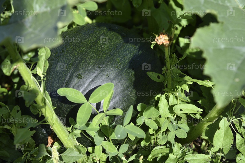 Плод зеленой тыквы к кустам в летнем саду. Тыква в зеленых листьях в лучах солнца. Красивая тыква летом