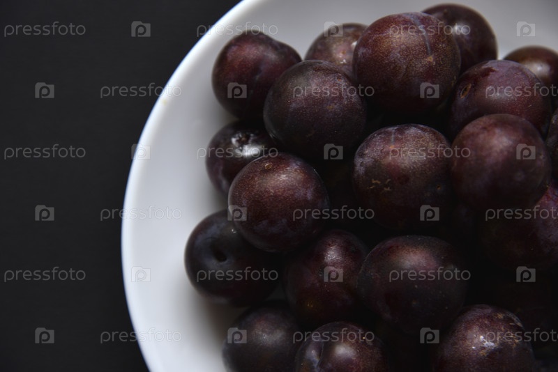 Спелые фиолетовые плоды сливы на белой тарелке. Крупные плоды сливы крупным планом