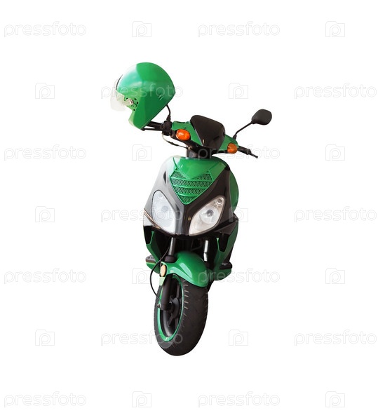 Вид спереди на зеленый скутер и шлем