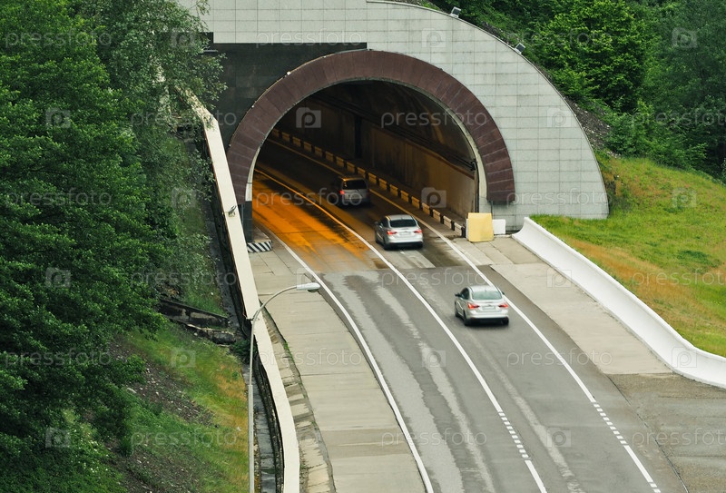 Автомобили движутся к автодорожному тоннелю. Строительство для автомобильного движения
