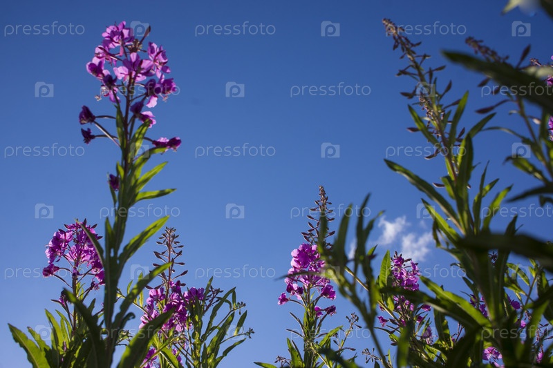 Цветущий кипрей, иван-чай на голубом небе. Иван-чайный луг. чай из иван-чая,