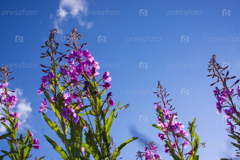Цветущий кипрей, иван-чай на голубом небе. Иван-чайный луг. чай из иван-чая,