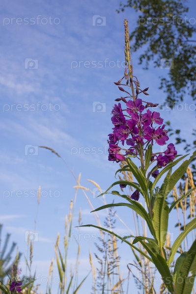 Цветущий кипрей, иван-чай на голубом небе. Иван-чайный луг. чай из иван-чая,