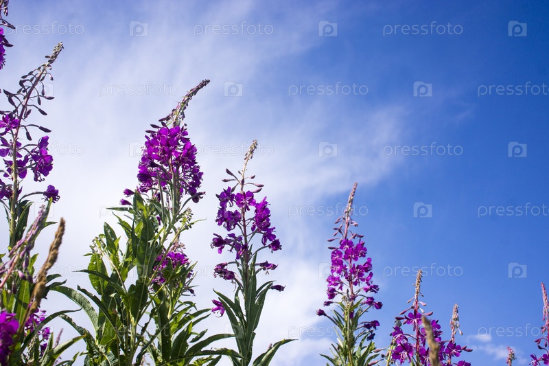 Цветущий кипрей, иван-чай на голубом небе. Иван-чайный луг. чай из иван-чая,