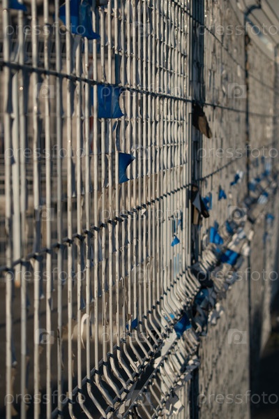 Металлический белый бежевый старый винтажный железный гриль с красочной клейкой лентой или бумагой или тканью, привязанной к нему крупным планом с размытым фоном в золотом солнечном свете